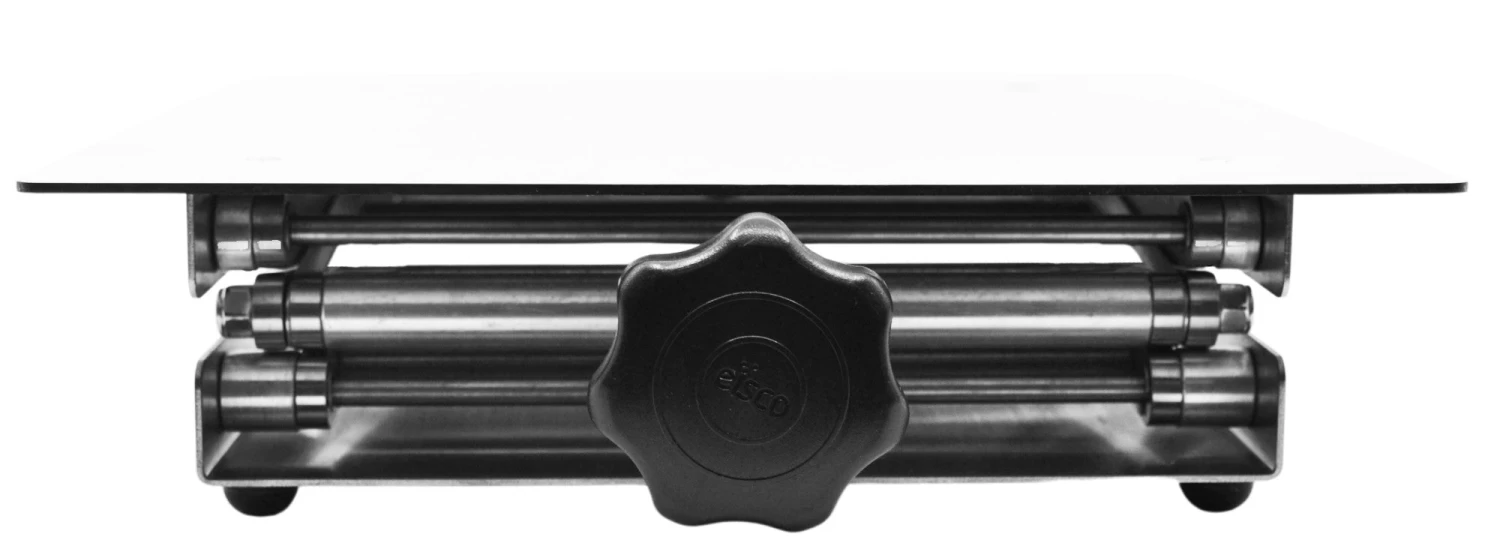 Adjustable labjack with top plate. Made of high quality rust-resistant stainless steel. Built to last. Stable table lift is used for regulating the height position of an object as a support apparatus. For physical, chemical, biological experiments and other daily use. Autoclavable.