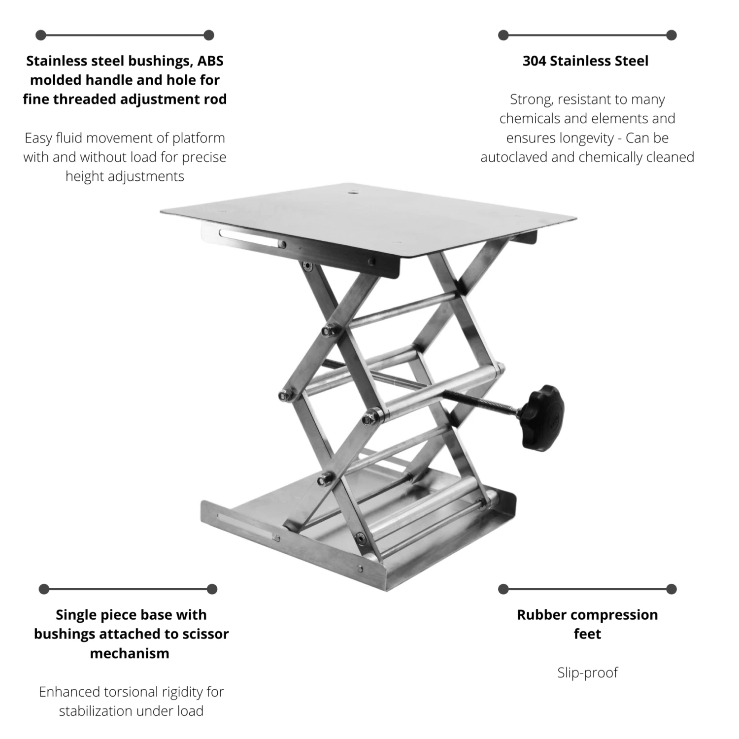 - EXTENDABLE || Adjustable lab jack with ABS molded handle and hole for fine threaded adjustment rod – Easy, fluid movement of platform with and without load for precise height adjustments