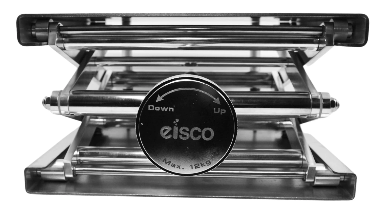 Adjustable labjack with top plate. Made of high quality rust-resistant stainless steel. Built to last. Stable table lift is used for regulating the height position of an object as a support apparatus. For physical, chemical, biological experiments and other daily use. Autoclavable.