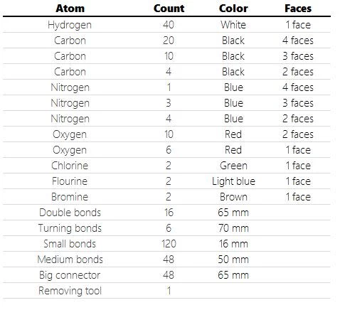 [40] Hydrogen (White, 1 face), [20] Carbon (Black, 4 faces), [10] Carbon (Black, 3 faces), [4] Carbon (Black, 2 faces), [1] Nitrogen (Blue, 4 faces), [3] Nitrogen (Blue, 3 faces), [4] Nitrogen (Blue, 2 faces), [10] Oxygen (Red, 2 faces), [6] Oxygen (Red, 1 face), [2] Chlorine (Green, 1 face), [2] Flourine (Light blue, 1 face), [2] Bromine (Brown, 1 face), [16] Double bonds (65 mm), [6] Turning bonds (70 mm), [120] Small bonds (16 mm), [48] Medium bonds (50 mm), [48] Big connector (65 mm), [1] Removing tool