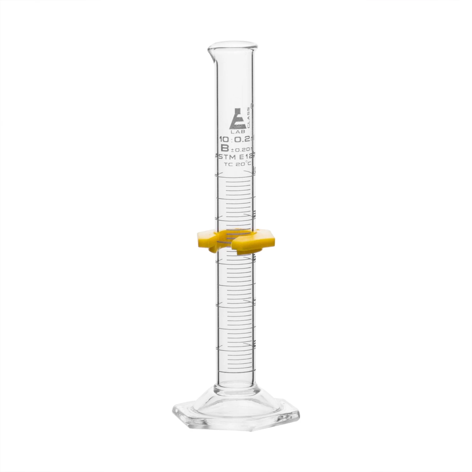 10mL capacity measuring cylinder made of high quality, heavy duty borosilicate 3.3 glass. Autoclavable, with superior chemical durability. Low temperature gradient – can withstand high temperatures & thermal shocks. With large, white single scale in 0.2mL graduations and hexagonal base for extra stability. Class B tolerance, ±0.20mL as per ISO/ASTM. Fitted with a plastic, hexagonal protective collar. Cylinder stands 5.5″ tall, with a base measuring 2″ wide. Inner diameter of cylinder body measures 12.7mm (0.5″), and outer diameter measures 16.5mm (0.65″).