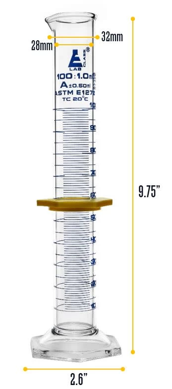 100mL capacity measuring cylinder made of high quality, heavy duty borosilicate 3.3 glass. Autoclavable, with superior chemical durability. Low temperature gradient – can withstand high temperatures & thermal shocks. With large, blue single scale in 1.0mL graduations and hexagonal base for extra stability. Class A tolerance, ±0.50mL as per ISO/ASTM. Fitted with a plastic, hexagonal protective collar. Cylinder stands 9.75″ tall, with a base measuring 3″ wide. Inner diameter of cylinder body measures 29.2mm (1.15″), and outer diameter measures 31.8mm (1.25″).