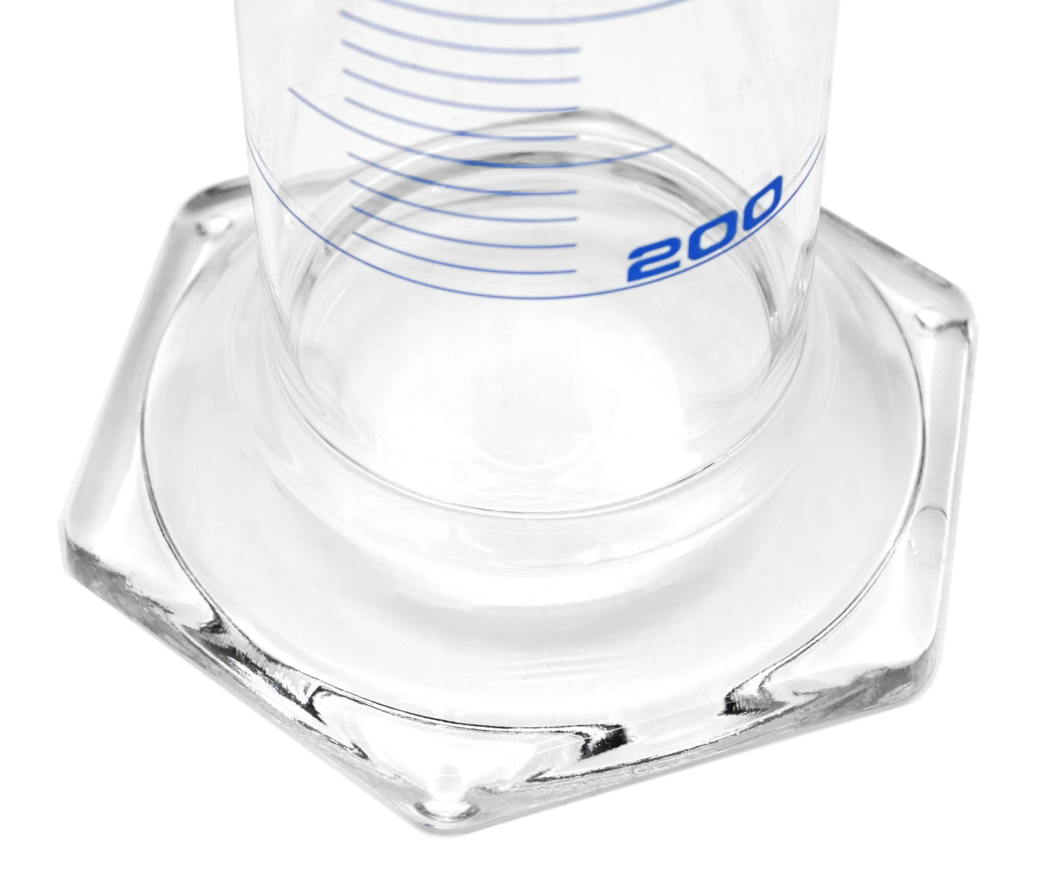 2000ml graduated measuring cylinder made of high quality, heavy duty Borosilicate 3.3 glass. Spout for easy pouring, and hexagonal base for extra stability. Class A tolerance, ±10.0ml as per DIN EN ISO 4788 standard. Blue printed graduations and specifications. 20ml subdivisions. Cylinder stands 22.25″ tall, with a base measuring 5.8″ wide. Inner diameter of cylinder body measures 79mm (3.1″), and outer diameter measures 83mm (3.25″).
