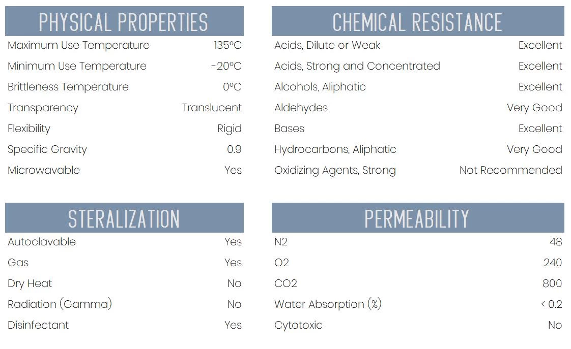 Microwavable and resistant to fatigue for long term durability. High heat tolerance with a temperature range of -20 to +135°C. Good to excellent chemical resistance. Autoclavable at 121°C for easy cleaning and sterilization.