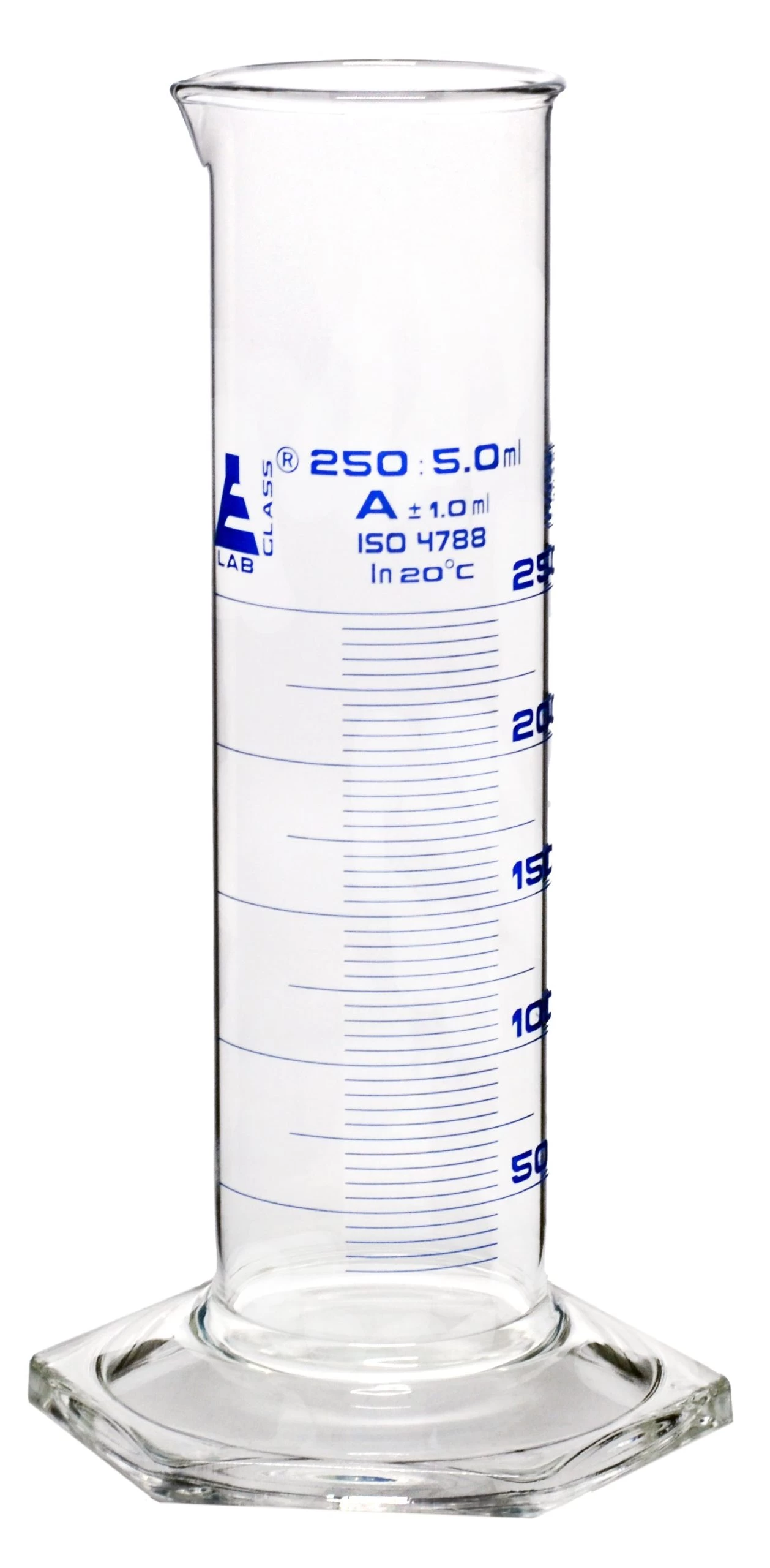 250ml capacity squat form measuring cylinder, with blue graduations, made of high quality, heavy duty Borosilicate 3.3 glass. Hexagonal base for extra stability. Class A, Tolerance: ±1.00ml, Sub Div: 5.0ml.