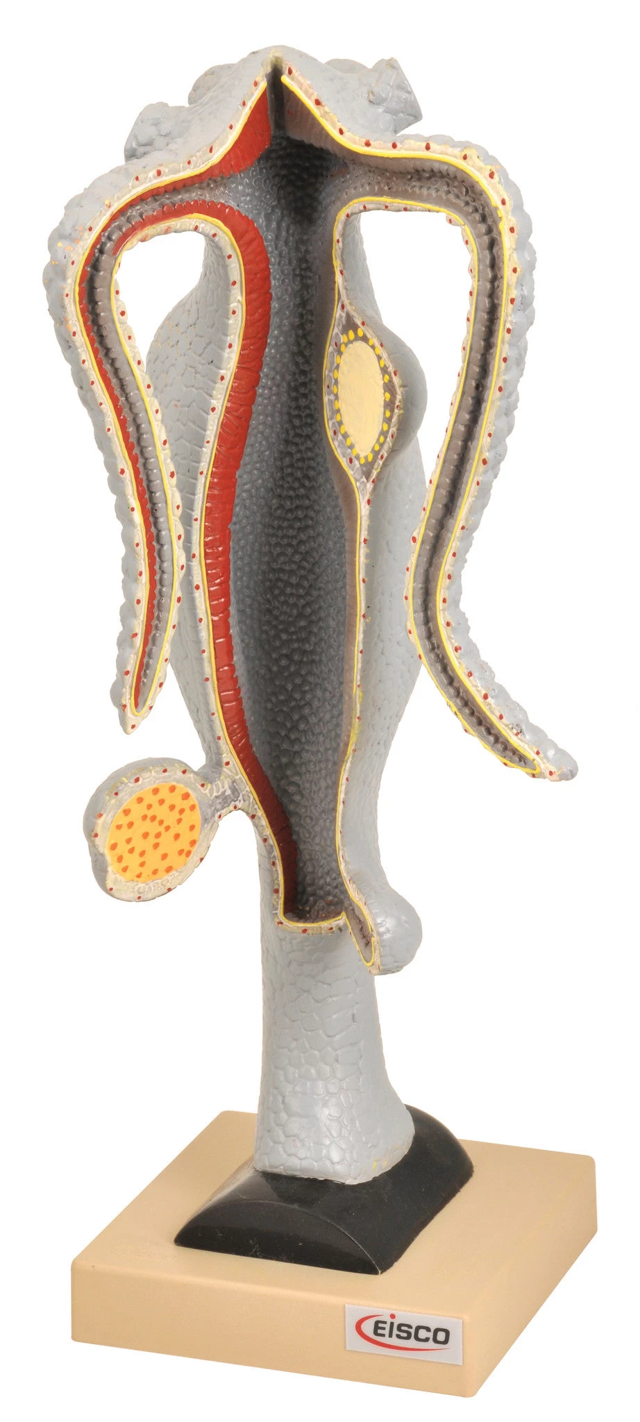Enlarged 25 times. Model showing hydra anatomy in longitudinal section Enlarged 25 times. Model showing anatomy in longitudinal section mesoglea, ectoderm, entoderm, male & female egg- cells. Mounted on base. Numbered with English Key Card.Size 15 x 13 x 38 cm approx. Weight 910 g approx.