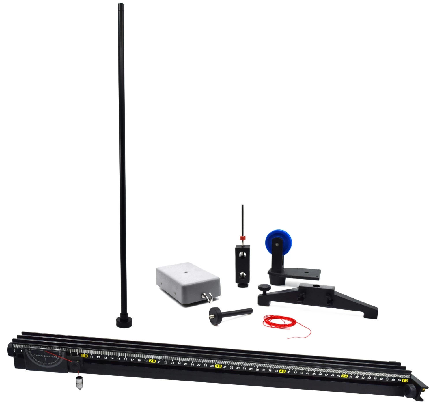 - Kit includes inclined plane, car, pulley, nylon cord, support rod and sliding protractor with metal bob
