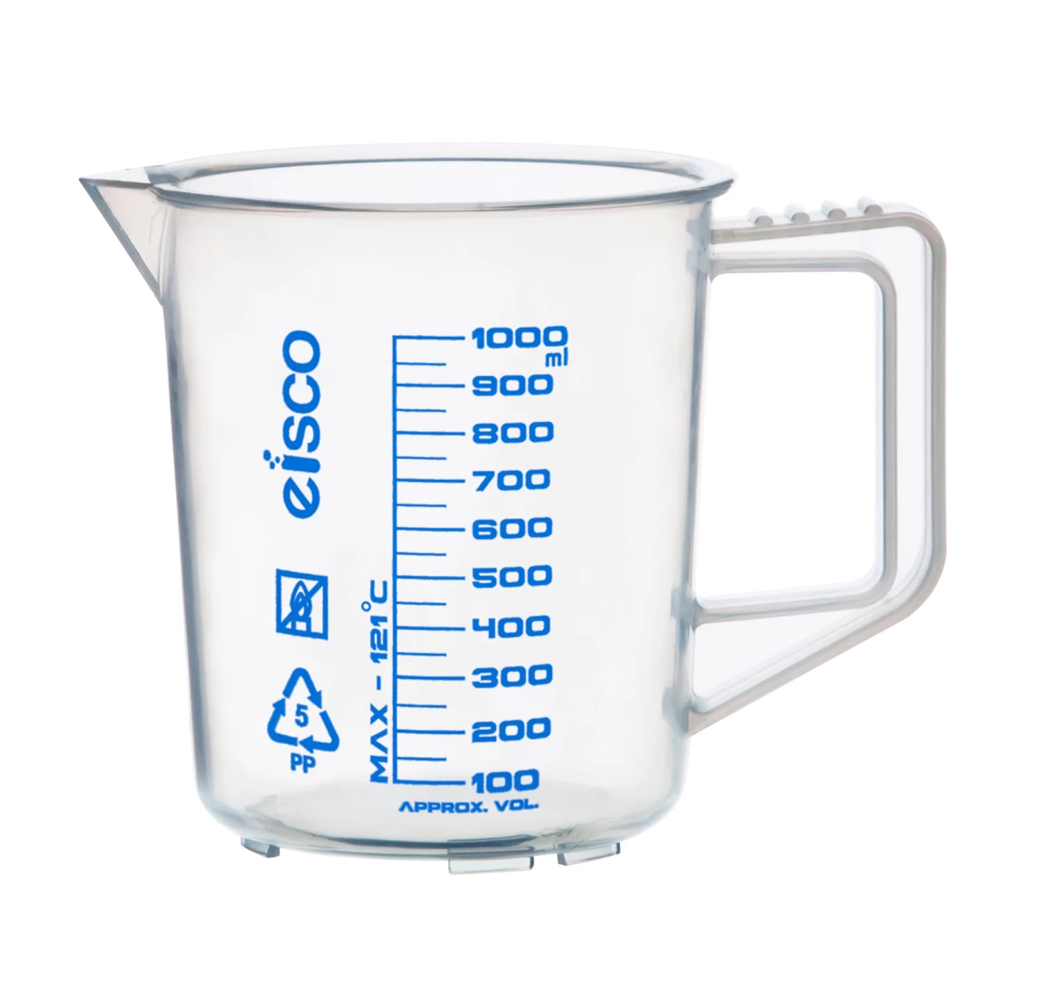 1000ml measuring jug made of high quality, heavy duty polypropylene. Short form. Jug features a non-drip spout & handle with thumb grips for easy pouring. Transparent, with easy to read screen printed graduations and specifications. Autoclavable & microwavable with superior chemical durability.