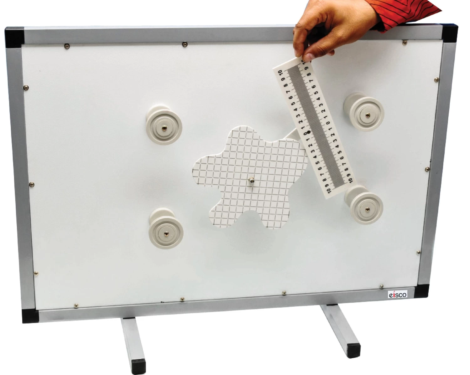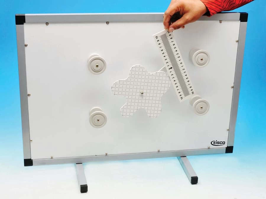 Consists of irregular shaped body, a system for measurement of distances, 4 pulleys on magnet, one roll of thread and one magnet on hook.