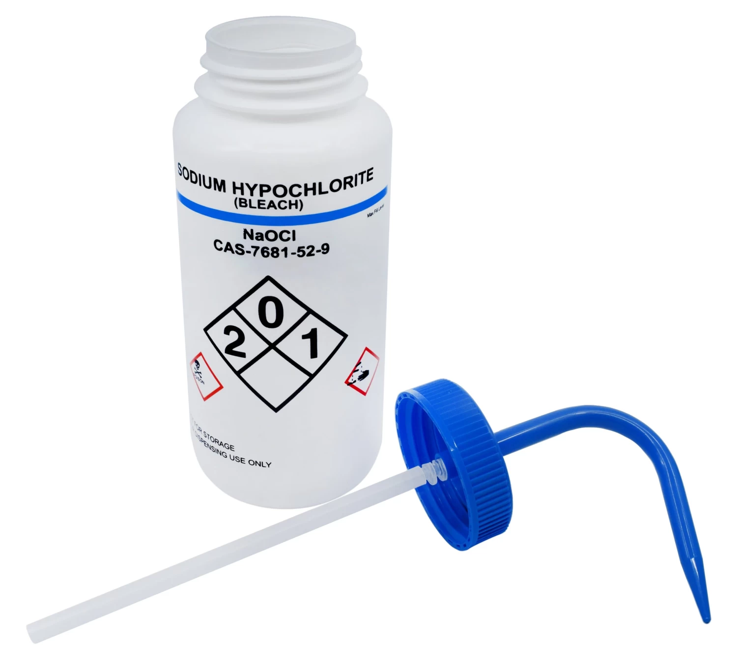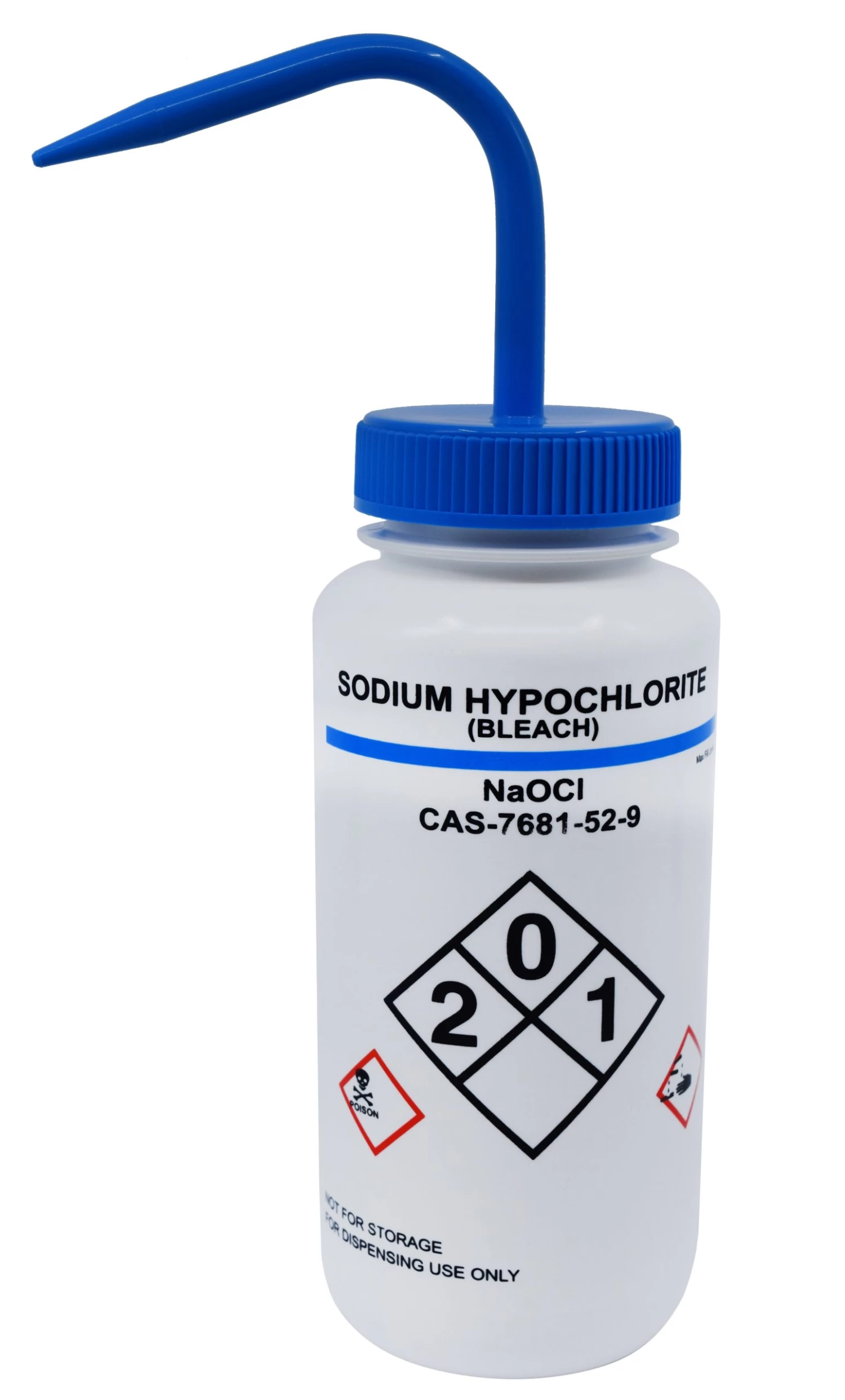 Labelled wash bottle for Sodium Hypochlorite (bleach). Bottle is made of LDPE, is self venting and features easy to read text and warning indicators. 500ml capacity. Bottle measures 9″ tall, and 2.75″ in diameter.