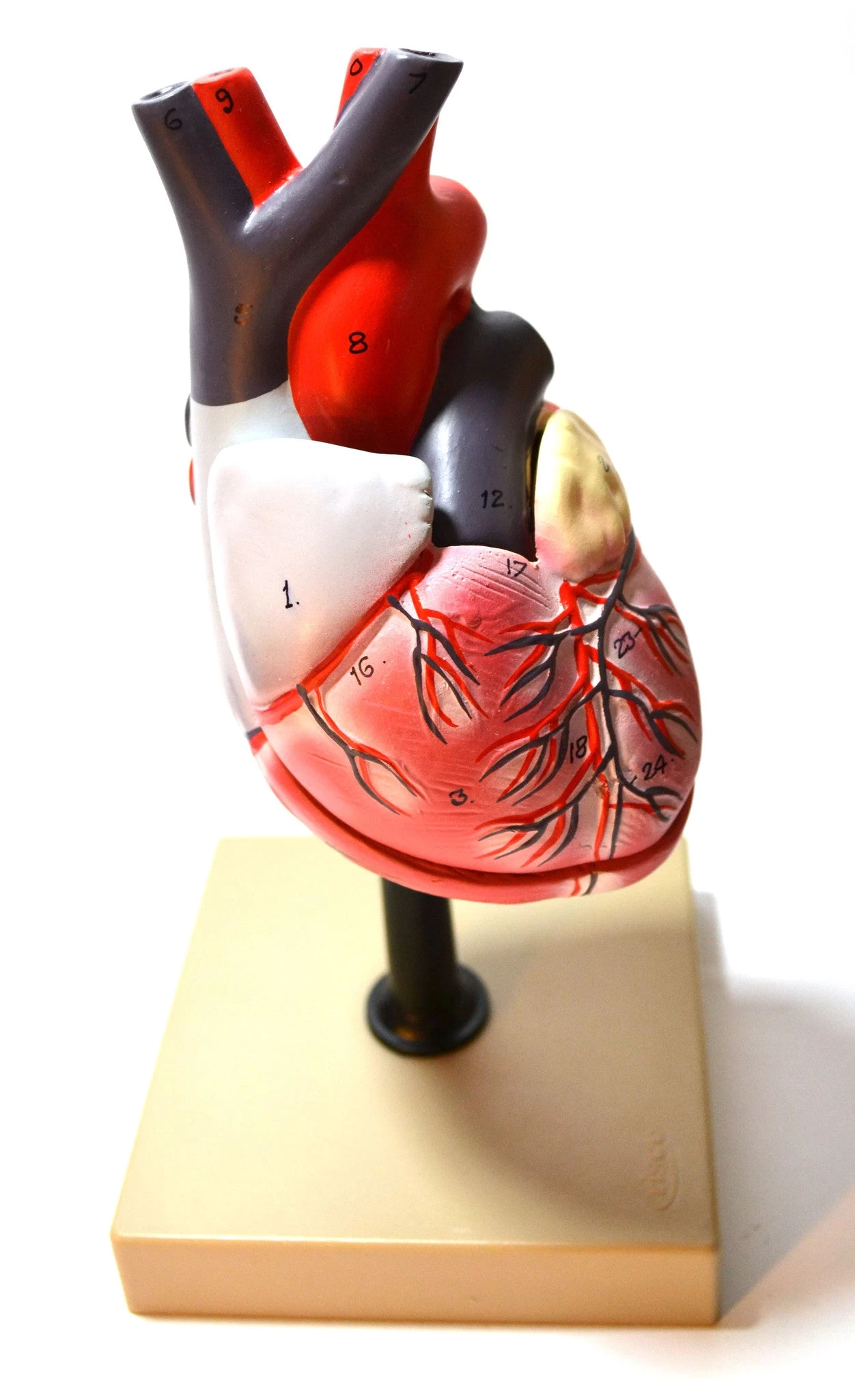 The detailed 3D rendering of the human heart with its vibrantly colored anatomy is ideal for studying the structure and function of the human heart. Key anatomical parts are colored and numbered for comparison with the anatomy key that is included. The heart itself can be removed from the base and the model also separates so that the inner anatomy (atria, ventricles, and valves) can be further explored. This model provides a visually and kinesthetically effective method for studying the structure and function of the human heart.