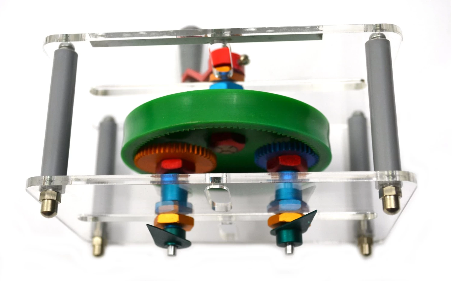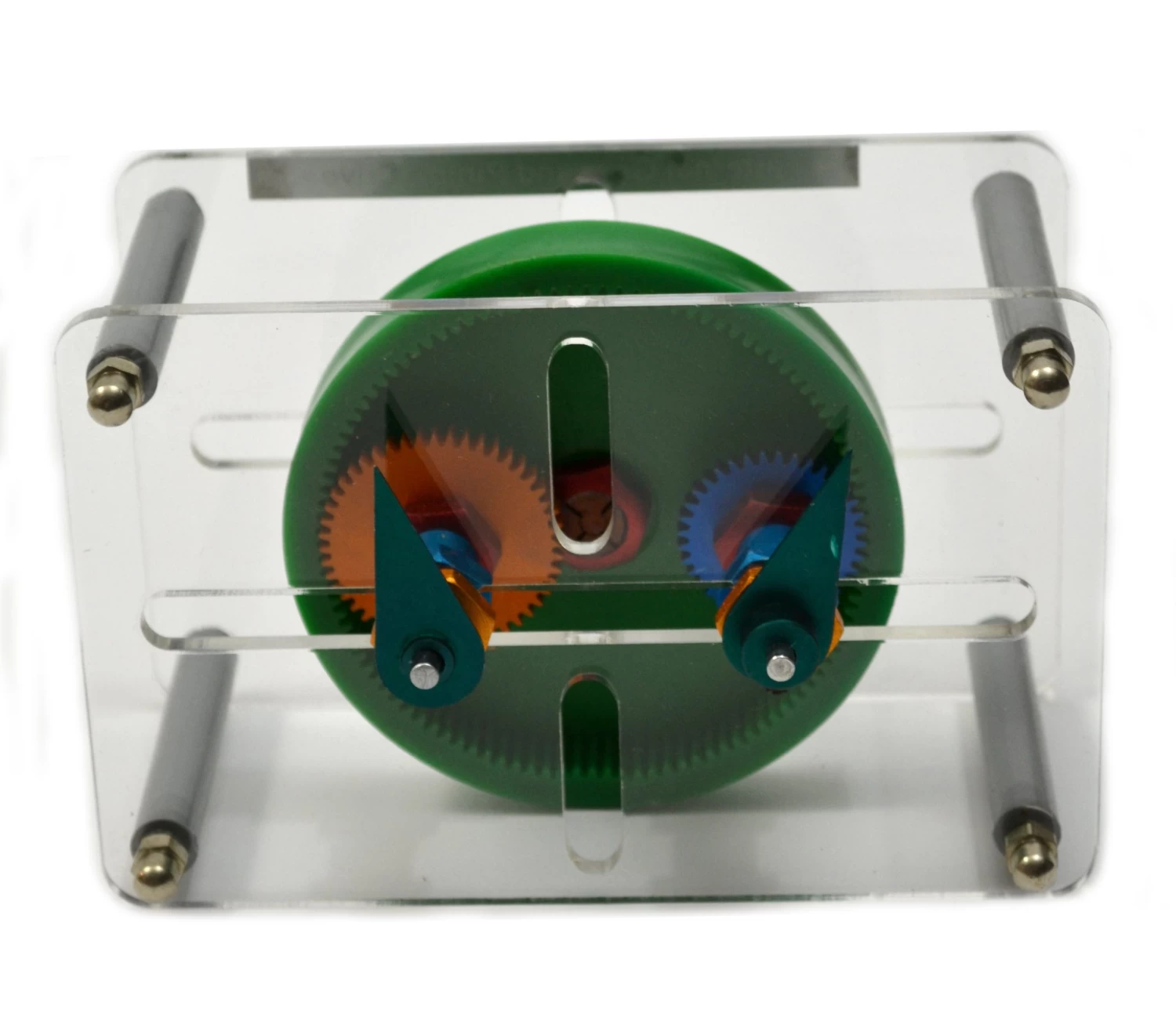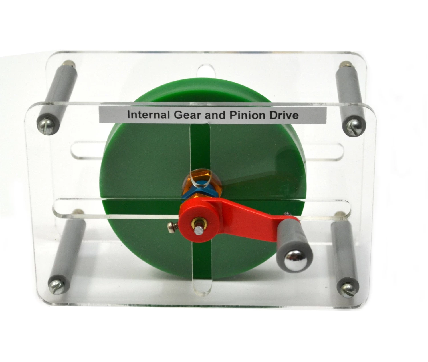 This demonstration shows the fundamentals of how an internal gear and pinion drive. The system has a hand crank. Perfect for the classroom. Constructed with heavy duty metal and plastic. Unit is open system to study and sandwiched by two clear plastic plates. Nice bench top or desk top item