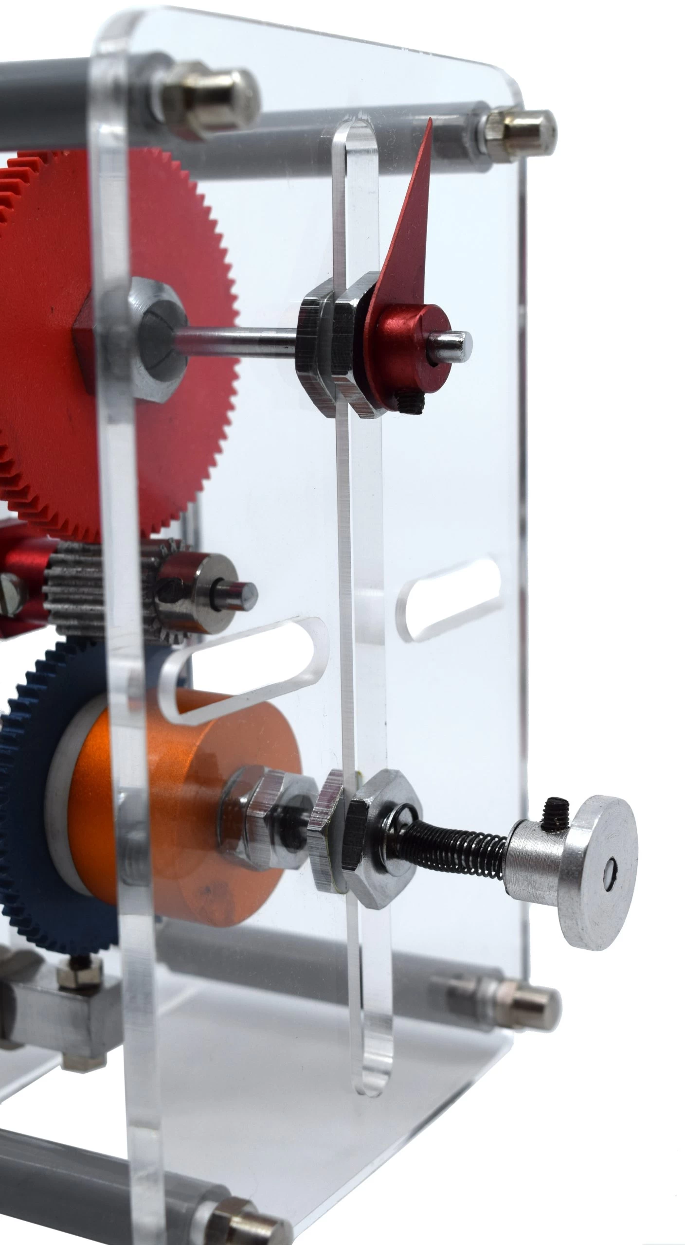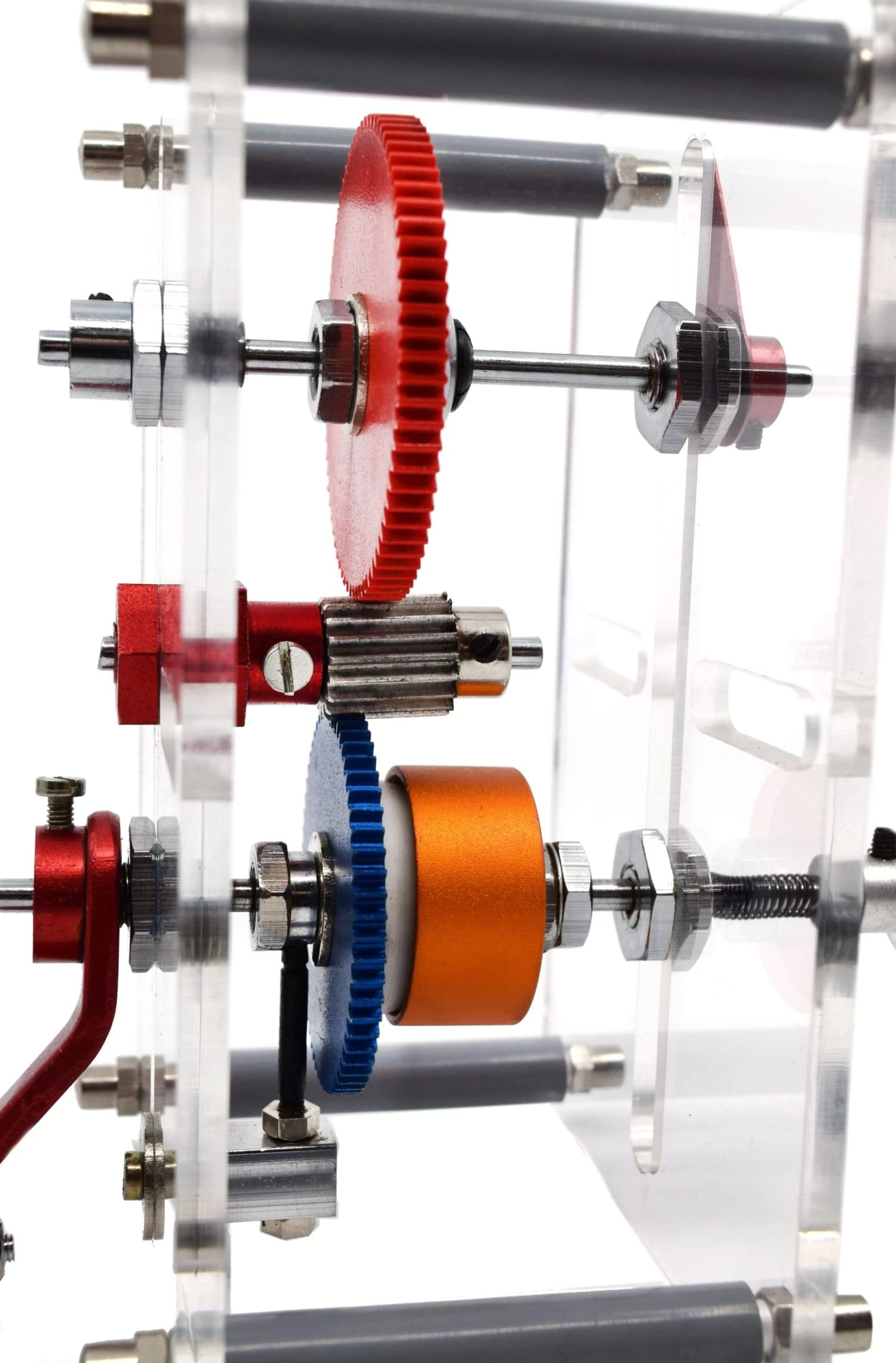 This demonstration shows the fundamentals of how a cone clutch works in a drive system. The system has a hand crank and a push button to engage clutch on the opposing side. Perfect for the classroom. Constructed with heavy duty metal and plastic. Unit is open system to study and sandwiched by two clear plastic plates.
