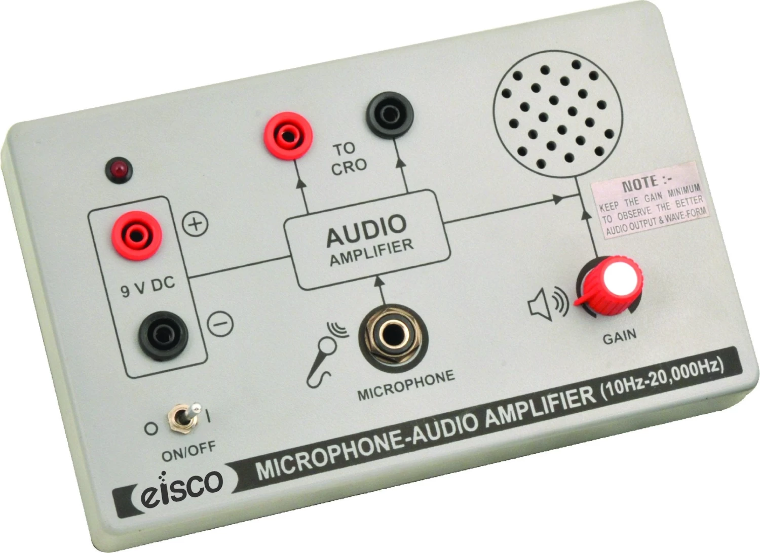 This is a simple and wonderful experiment, one can view the spectrum of the CRO. The microphone is connected to the input and the amplified output is available on the speaker and the amplified spectrum can be viewed on the CRO. The demo unit is operated on external + 9V DC supply.