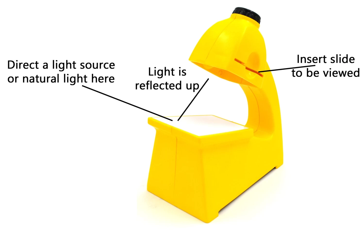This economical microscope slide viewer is light weight and economical. The unit does not require batteries and does need to be hooked to an electric. Light from a lamp or natural light can be directed to the white surface and the light will reflect into the viewer.