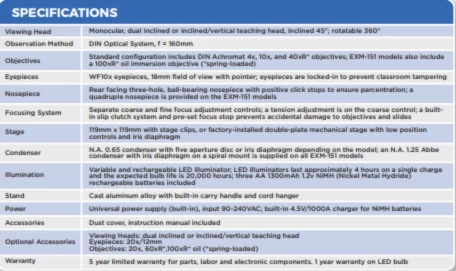 Easy to use and student friendly, the Accu-Scope EXM-150-MS microscope features a monocular head with a WF10x/18mm eyepiece with pointer. Highly portable with a built-in carry handle, cord wrap, and rechargeable LED illumination. It has a mechanical stage with separate coarse and fine focus adjustment controls with tension adjustment on the coarse control, and an N.A. 1.25 abbe condenser on spiral mount with iris diaphragm. A built-in slip clutch system and pre-set focus stop prevents accidental damage to objectives and slides. Includes DIN achromat 4x, 10x, and 40xR* objectives (* spring loaded).