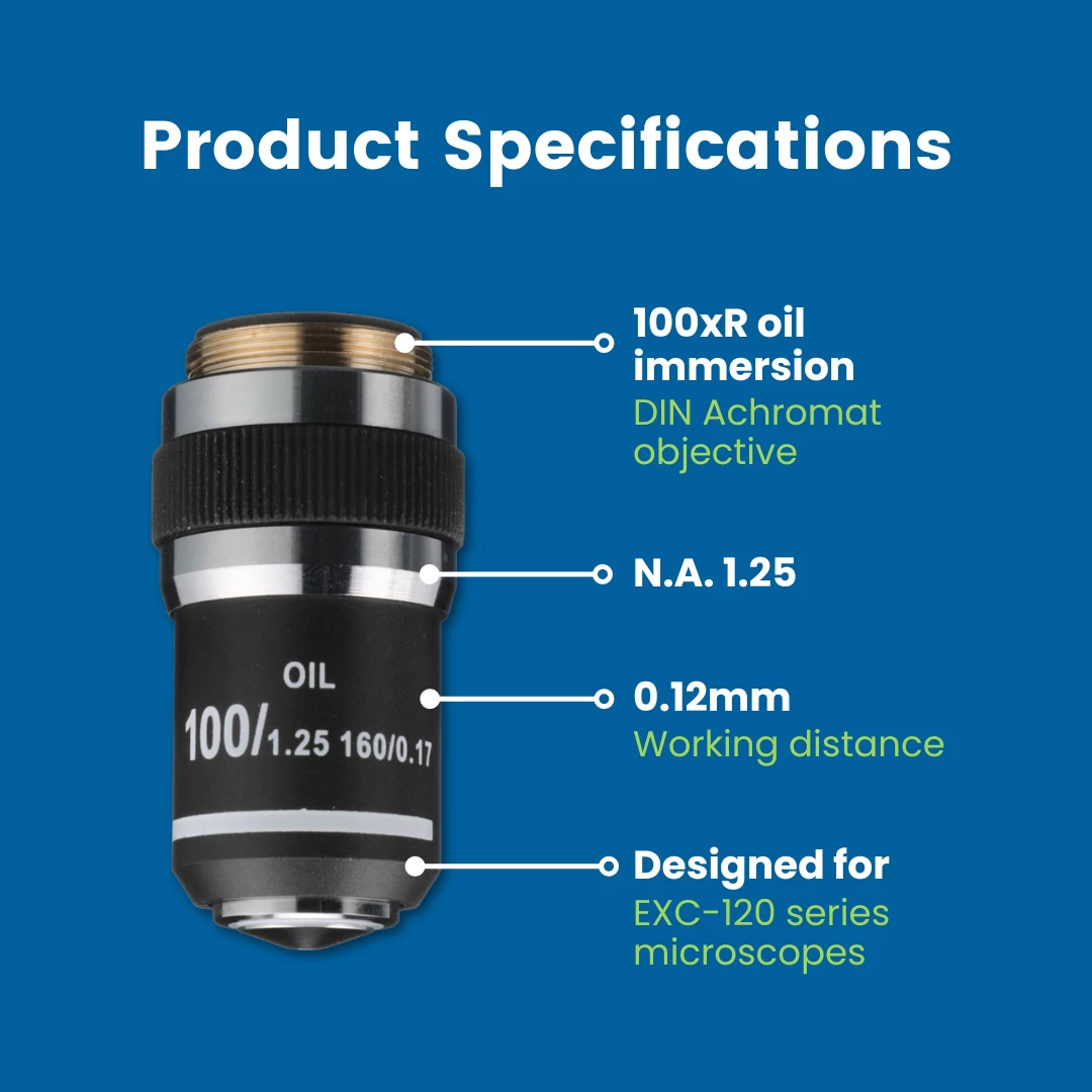 - 100xR Oil Immersion DIN Achromat Objective fits Accu-Scope EXC-120 series compound microscopes
