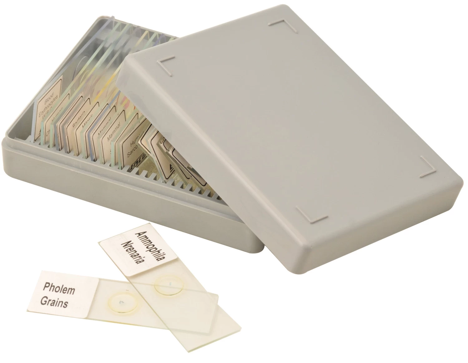 Set of 25. Supplied in Box.Cerabellum, section lleum, sectionSpinal cord, TS, Duodenum, TSNerve, TS and LS, Appendix, TSArtery and vein, TS, Colon, VSCardiac muscle, section, Pancreas, sectionLymph node, section Liver, section, Spleen, sectionKidney, section Scalp, VS, Ovary, sectionSkin, heavily pigmented, section Uterus, sectionStriated muscle, section Cervix, sectionMammary gland, section Testis, sectionOesophagus, section Thyroid gland, sectionStomach, fundic portion, section