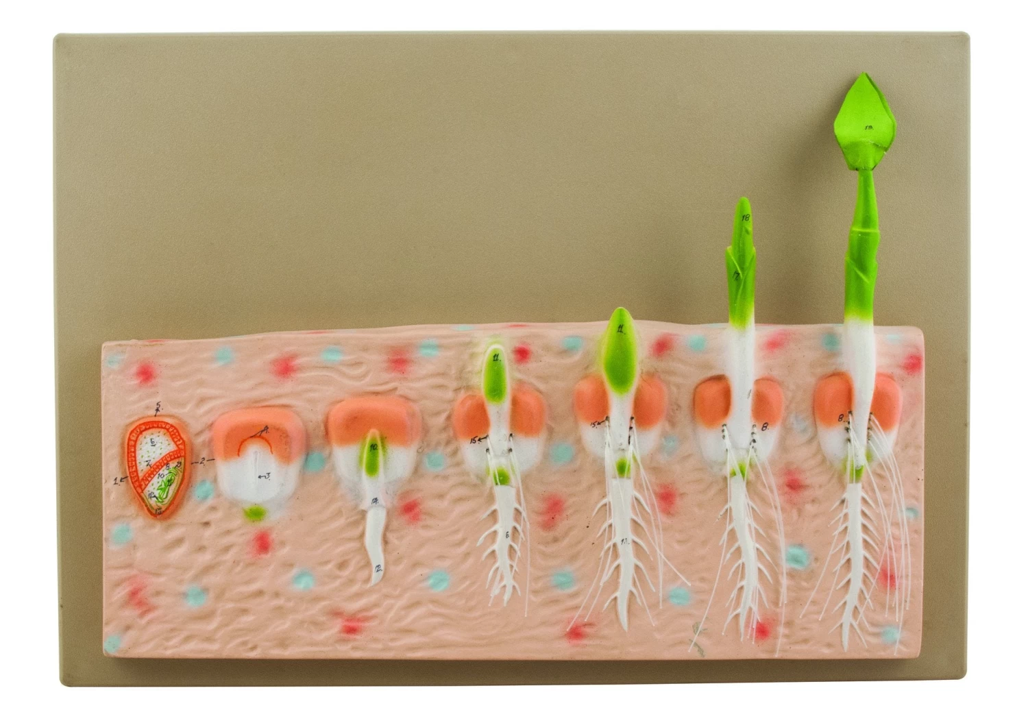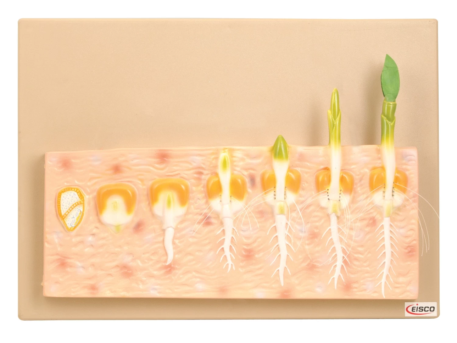 Model showing the germination of monocot plant (maize) seeds of development. On base. Supplied with English Key Card.