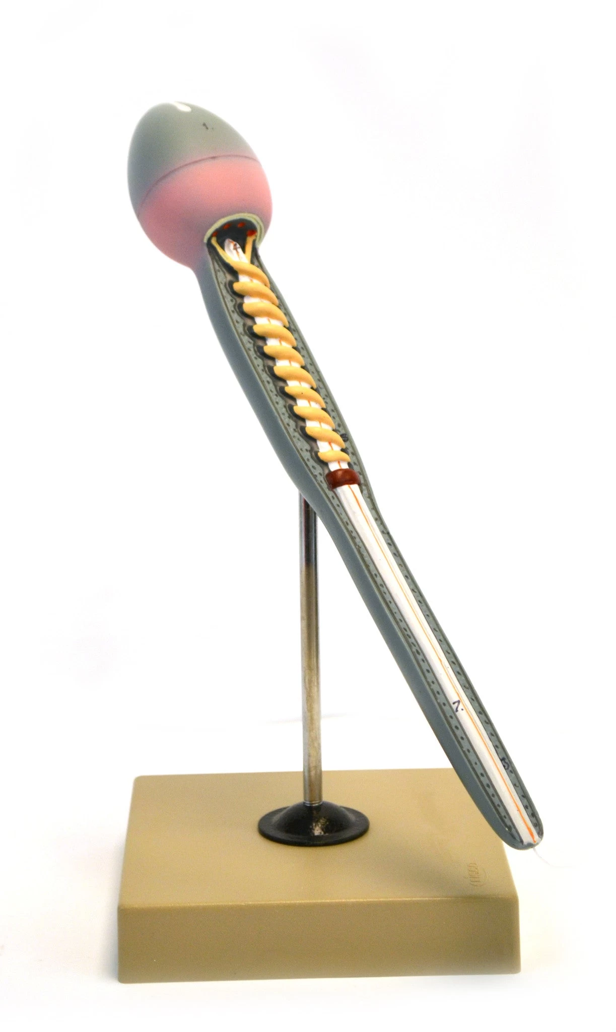 The detailed 3D rendering of a human sperm is greatly magnified, revealing the internal structure of the gamete: head, mid, tail, centriole, mitochondria, outer dense fibers, and axial filament. The model provides a visually and kinesthetically effective method by which to study the structure and function of a human sperm.