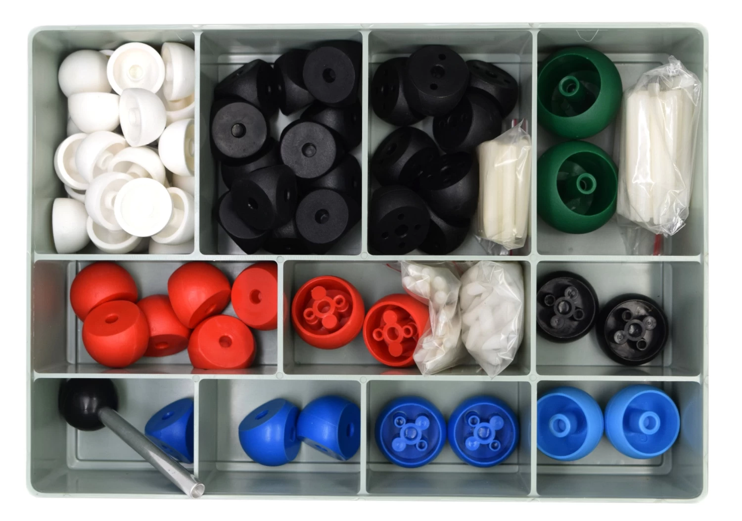 Kit Includes: Instructions booklet, 13.5″ x 9.5″ x 3.5″ storage case, 1 removing tool, 26 Hydrogen atoms, 22 Carbon atoms, 5 Nitrogen atoms, 8 Oxygen atoms, 2 Fluorine atoms, 2 Chlorine atoms, 12 double joints, 66 small joints, 32 medium joints, 44 big joints.