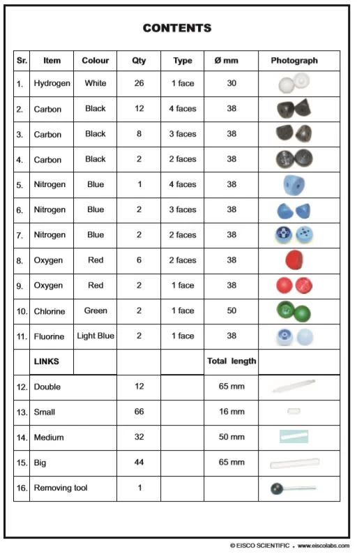 - Kit Includes: Instructions booklet, 13.5″ x 9.5″ x 3.5″ storage case, 50 Hydrogen atoms, 30 Carbon atoms, 5 Nitrogen atoms, 4 Oxygen atoms, 1 Fluorine atom, 1 Chlorine atom, 1 Bromine atom, 1 Iodine atom, 100 colored links, 50 standard joints, 20 orbital joints.