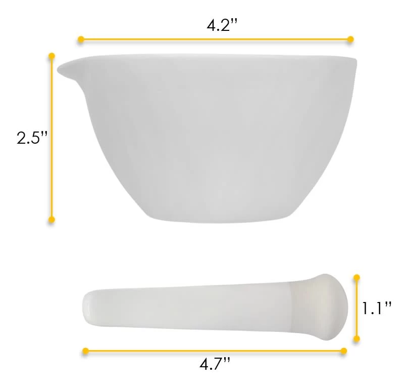 - 5 OUNCE CAPACITY || Mortar has a 5oz (150ml) capacity and measures 4.2″ wide and 2.5″ tall. Pestle measures 4.7″ in length and rounded end measures 1.1″ in diameter