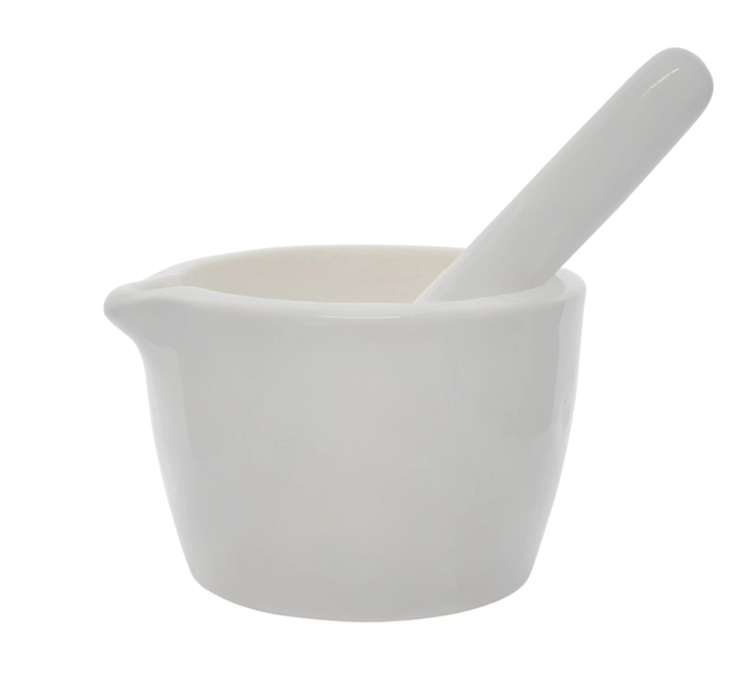 Single, heavy duty Mortar and Pestle set with a 2.4oz (70ml) capacity. Perfect for finely grinding and crushing herbs, spices, seeds & nuts, grains, pigments, powders, pills and more. High walls prevent material from spilling out while being crushed. Designed for use in professional laboratories, but makes an excellent addition to any kitchen. Mortar and pestle are both made of solid porcelain. Resistant to chips and cracks. Inside grinding surface of mortar and the rounded end of the pestle are unglazed for precise grinding and crushing. Mortar features a contoured spout for pouring and transferring of crushed material.