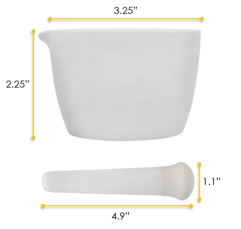 - 2.4 OUNCE CAPACITY || Mortar has a 2.4oz (70ml) capacity and measures 3.25″ wide and 2.25″ tall. Pestle measures 4.9″ in length and rounded end measures 1.1″ in diameter