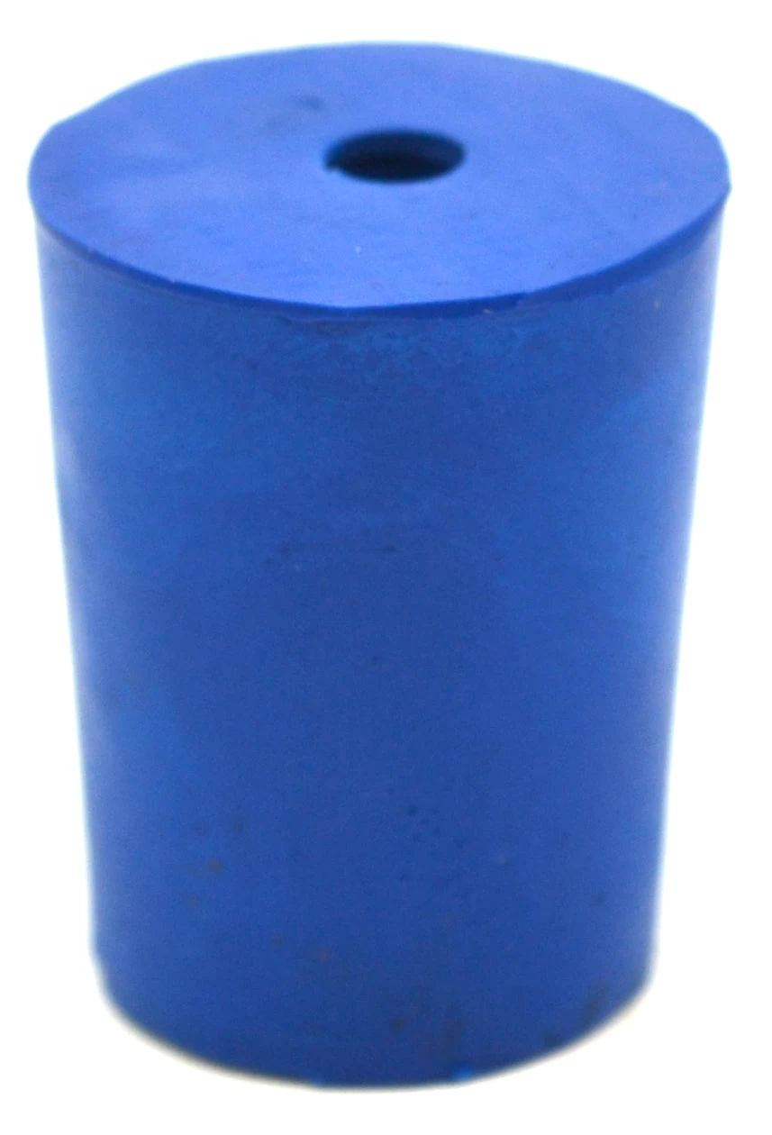 Blue neoprene stoppers with 1 hole. Holes measure 5mm each. Stopper measurements: 19mm Bottom, 22mm Top, 28mm Length. Made from long lasting neoprene rubber, oil resistant, Use up to temps of 250°F / 120°C . Suitable for use with petroleum products, minerals, oils, fats as well as most inorganic acids and bases. Pack of 10