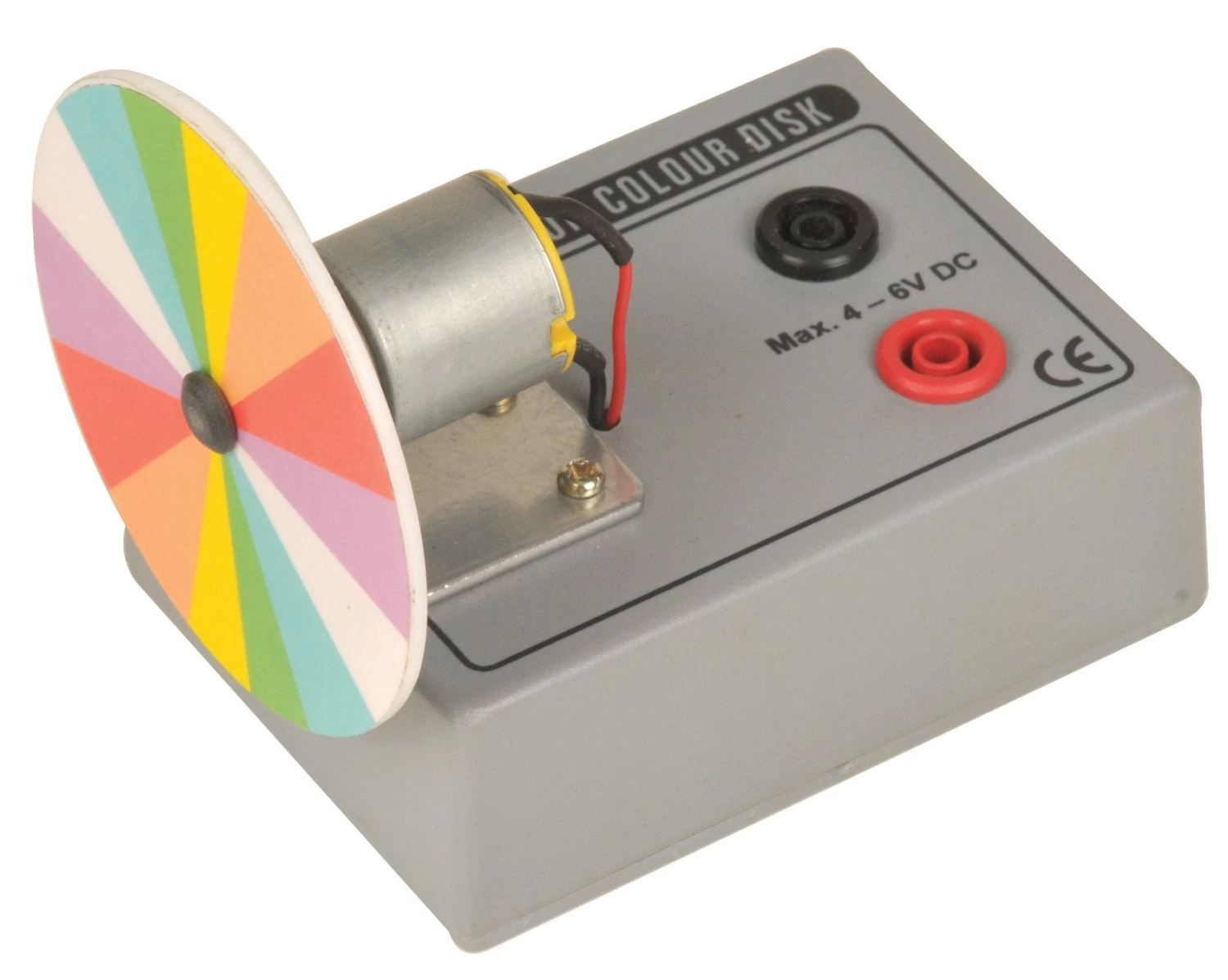 Newton disc 75 mm dia. mounted on the axle of a small motor, which is fitted on a plastic base-plate with connection sockets. Operates on 4-6 volts DC.