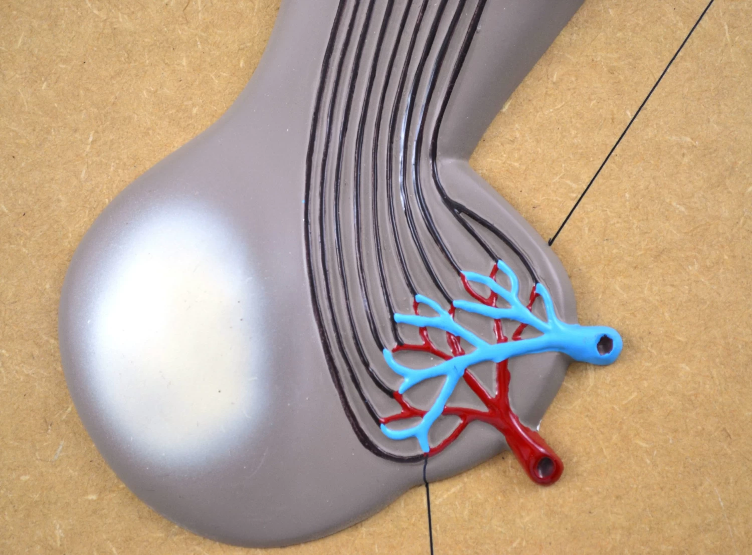 Hand painted model of the Pituitary gland showing magnified views. Mounted on 18″x16″ base.