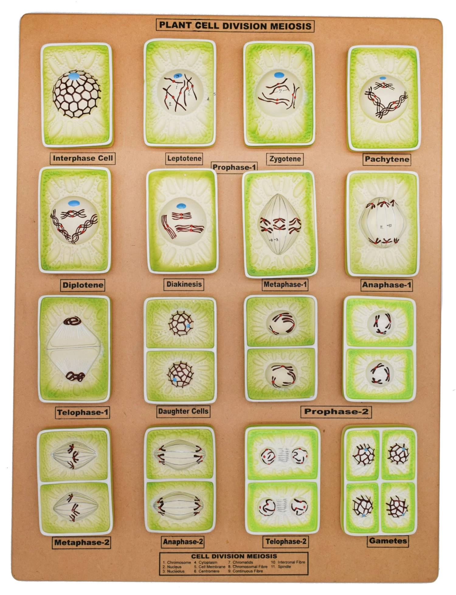 This model is a 3D rendering of the process of meiosis cell division in a plant cell. The model is made of tough fiberglass molded cell models on a sturdy MDF backboard and has clearly labeled phases. The cells are shown in great detail with vibrant colors and provide an internal view of the chromosomal shifts that occur throughout the process of meiosis in a plant cell.