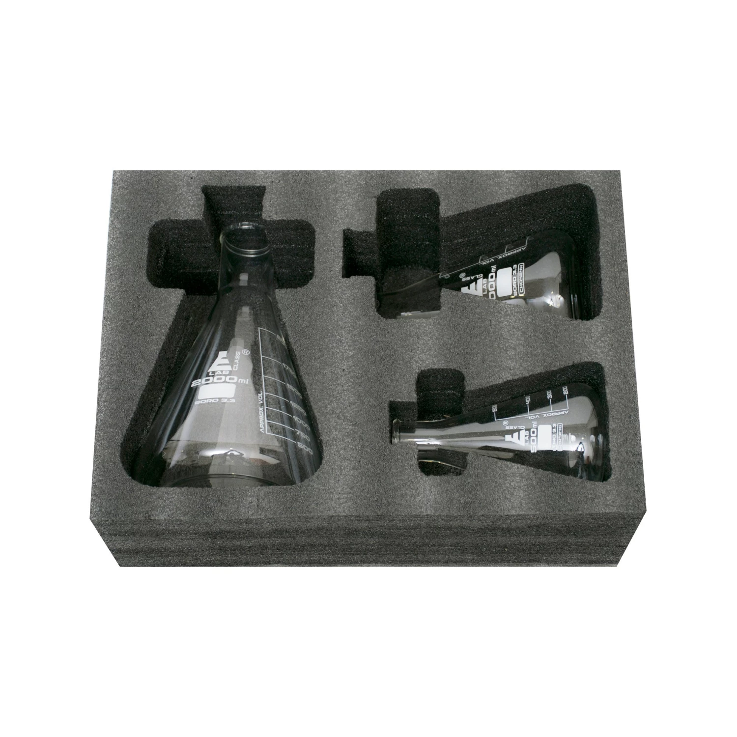 Three piece Erlenmeyer Flask set made of high quality, heavy duty, borosilicate 3.3 glass. Includes three, narrow neck flasks with 500ml, 1000ml & 2000ml capacities. Flasks feature white, printed graduations, and beaded rims. Uniform, thick walls provide excellent strength against breakage. Set is packaged in a custom fit, thick foam casing, for safe storage and worry free transport.