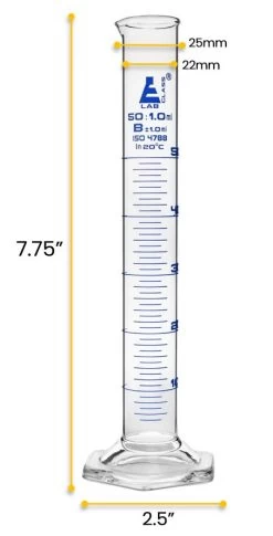 Graduated Cylinder, 50ml – Class B – Blue Graduations – Hexagonal Base