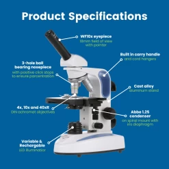 Microscope EXM-150 – Monocular Head, 40-400X Magnification, Disc Diaphagm, Cordless LED Illumination