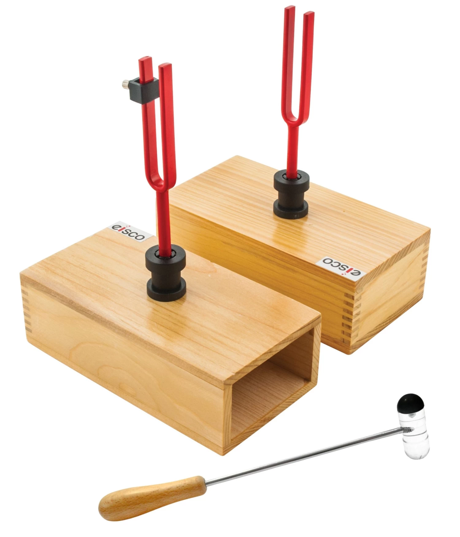 This premium set of “A” 440Hz steel tuning forks mounted on pine boxes is perfect for physics experiments demonstrating soundwave resonance and dissonance. It comes with a mass adjustment for one fork that will alter frequency, thus allowing for the creation and observation of beat frequencies or to demonstrate sympathy or resonance. Includes two tuning forks (6″L x 0.8″W x 0.5″D), two mounting boxes (7.5″L x 4″W x 2.5H); and one mallet.