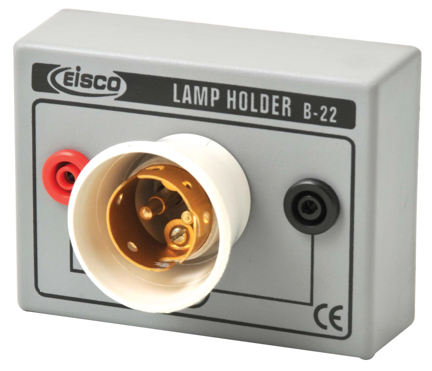 Made of hard plastic with one B22 socket and two 4mm banana plug terminals. Can be used inline with other components of Eisco Series PH1029. Accepts size B-22 (22mm) bayonet type bulbs. CE Certification. Bulb not included. Power Source needed for operation. An economical Eisco power source is PH0971DCAC which is not included