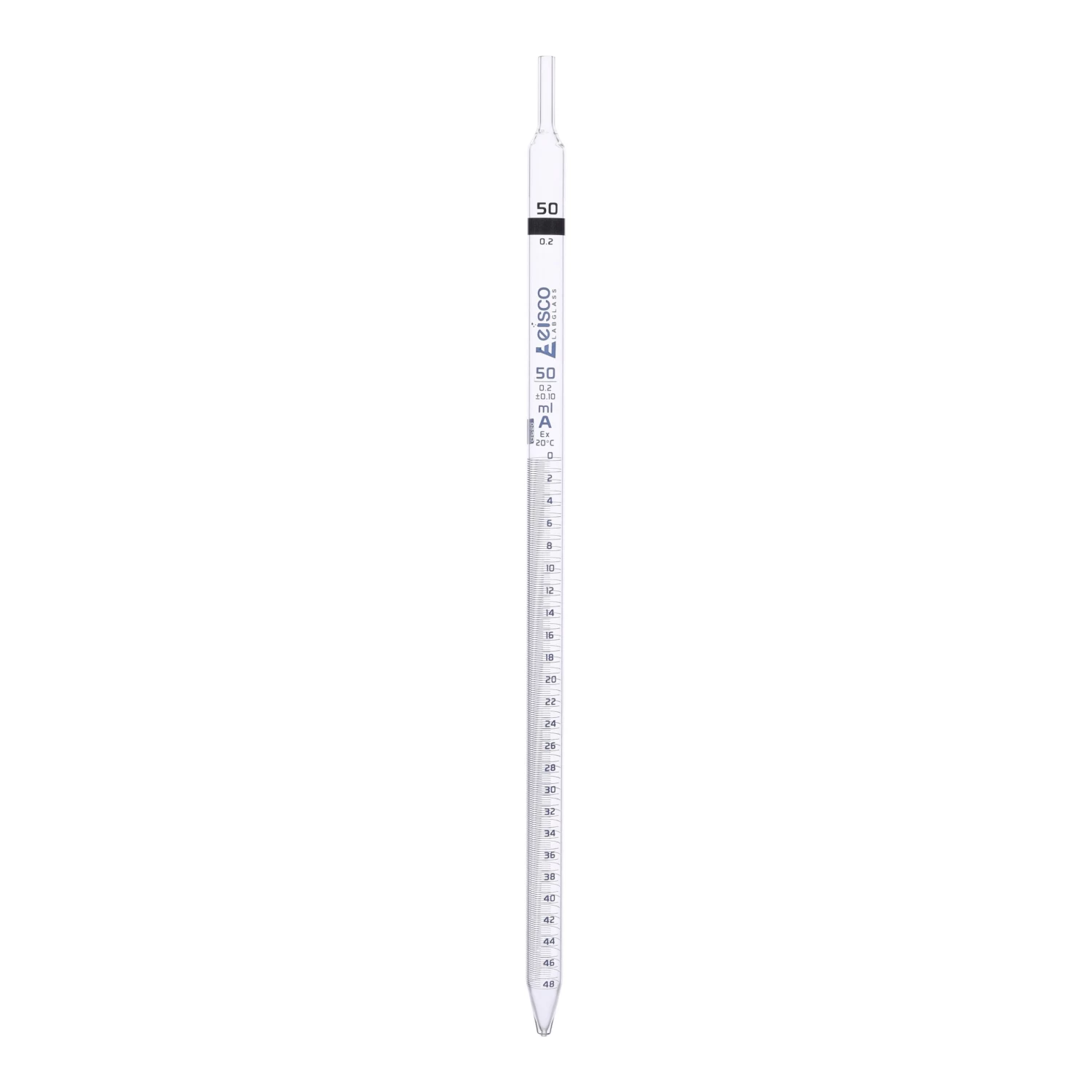 Serological Pipette made of high-quality, heavy-duty Borosilicate 3.3 glass. 50mL capacity, 0.20mL blue graduation lines, marked every 2mL. Class A, tolerance, ±0.10ml . Calibrated for delivery to jet.