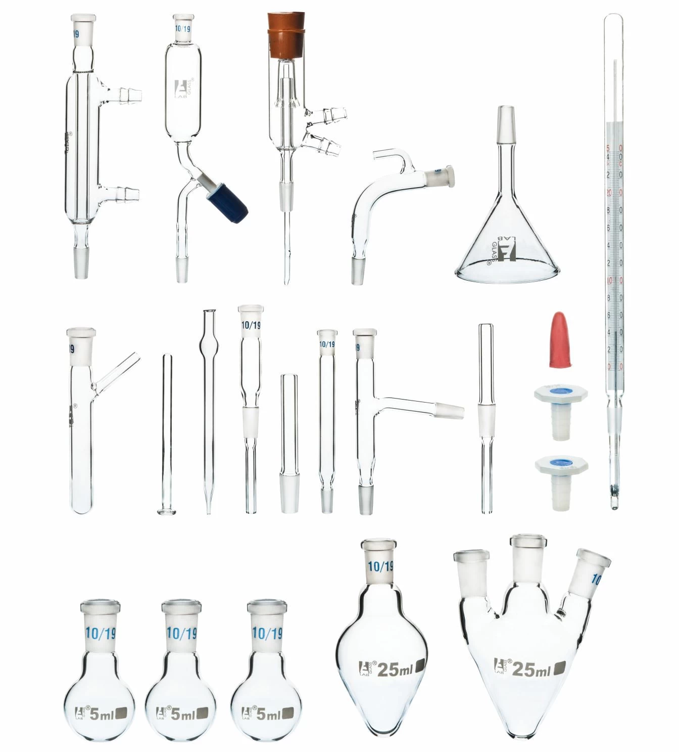 Consists of1 Liebig condenser1 Dropping funnel, 20 ml1 Flask, pear shape, 25 ml1 Flask, three neck, 25 ml3 Flask, round bottom, 5 ml1 Air leak / steam inlet1 Thermometer -10°C to 250°C1 Dropping pipette1 Rubber teat1 Receiver adapter2 Stopper1 Still head1 Air Condenser1 Filter funnel1 Receiver tube1 Willstätter nail1 Gas inlet tube1 Drying tube1 Stirrer