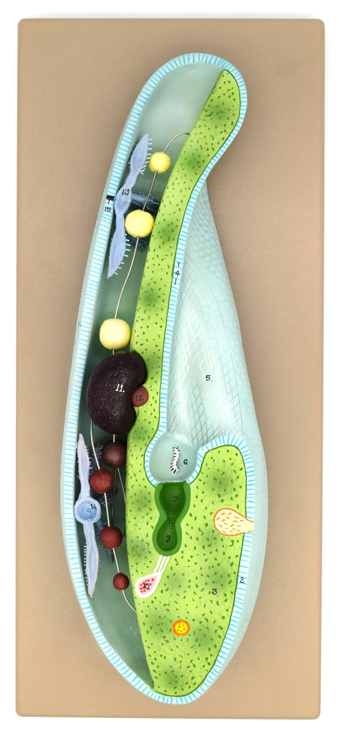 Enlarged 1000 times, shown in cut section the morphology of a Paramecium. The longitudinal section reveals the cell inventory of a protozoa macro and micronucleus, contractile vacuoles, cytostome with membranellae, myonemes and food vacuoles and the formation of the endoplasm and ectoplasm and the network of neuronemes. Mounted on 18″ x 8″ Base. Hand Painted with great detail. Includes a English key Card