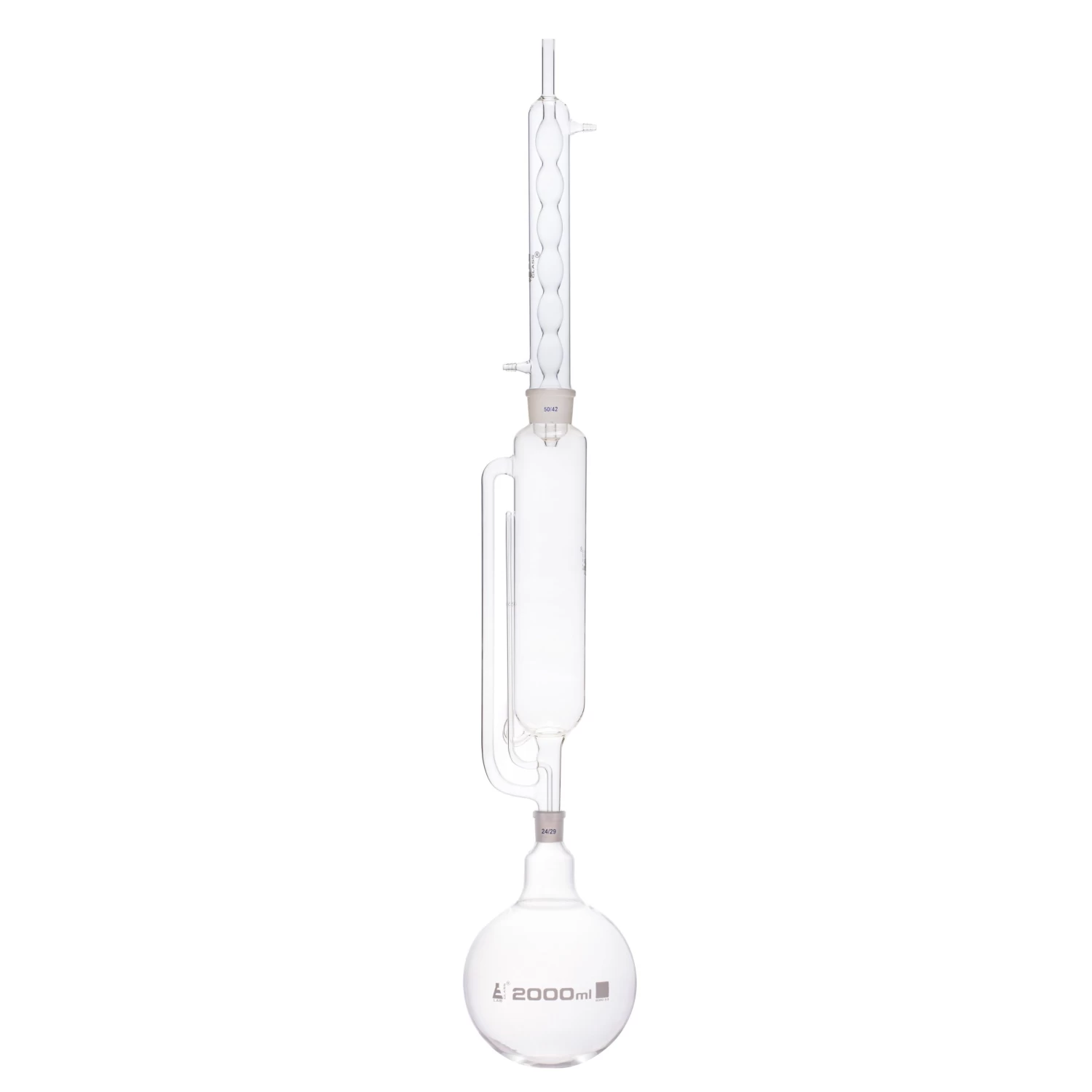 The Soxhlet Extraction Apparatus is used in the extraction of lipids and other materials from a solid sample when the desired compound has a limited solubility in a solvent. It allows for unmonitored and unmanaged operation while efficiently recycling a small amount of solvent to dissolve a larger amount of material. Applications include the production of tinctures, aromatic alcohols, and other products of botanical extraction; food testing; biofuels; and environmental analysis of soils, sludge, and wastes. Assembled from 3 separate sections: boiling flask, extractor chamber, and condenser. Interchangeable standard joints. Glass parts only; metal stands not included. Apparatus is approximately 40.4” tall when assembled. Extractor chamber capacity: 600mL; flask capacity: 2,000mL.