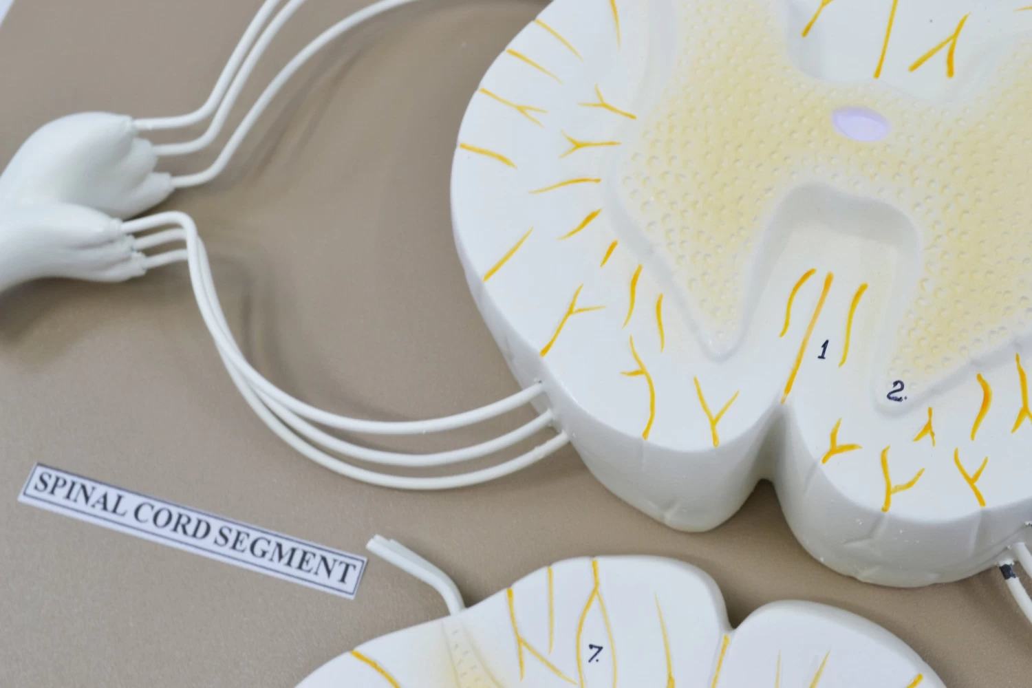 3D spinal cord model for use in teaching demonstrations. Enlarged 10 times natural size. Made from polyvinyl chloride (PVC) for durability. Model shows nerve branches. Includes key in English. Parts are numbered and referenced for easy identification. Great hands-on alternative to traditional teaching methods. Hand-painted using vibrant eco-friendly paint. Built from a custom mold. Designed by subject matter experts.