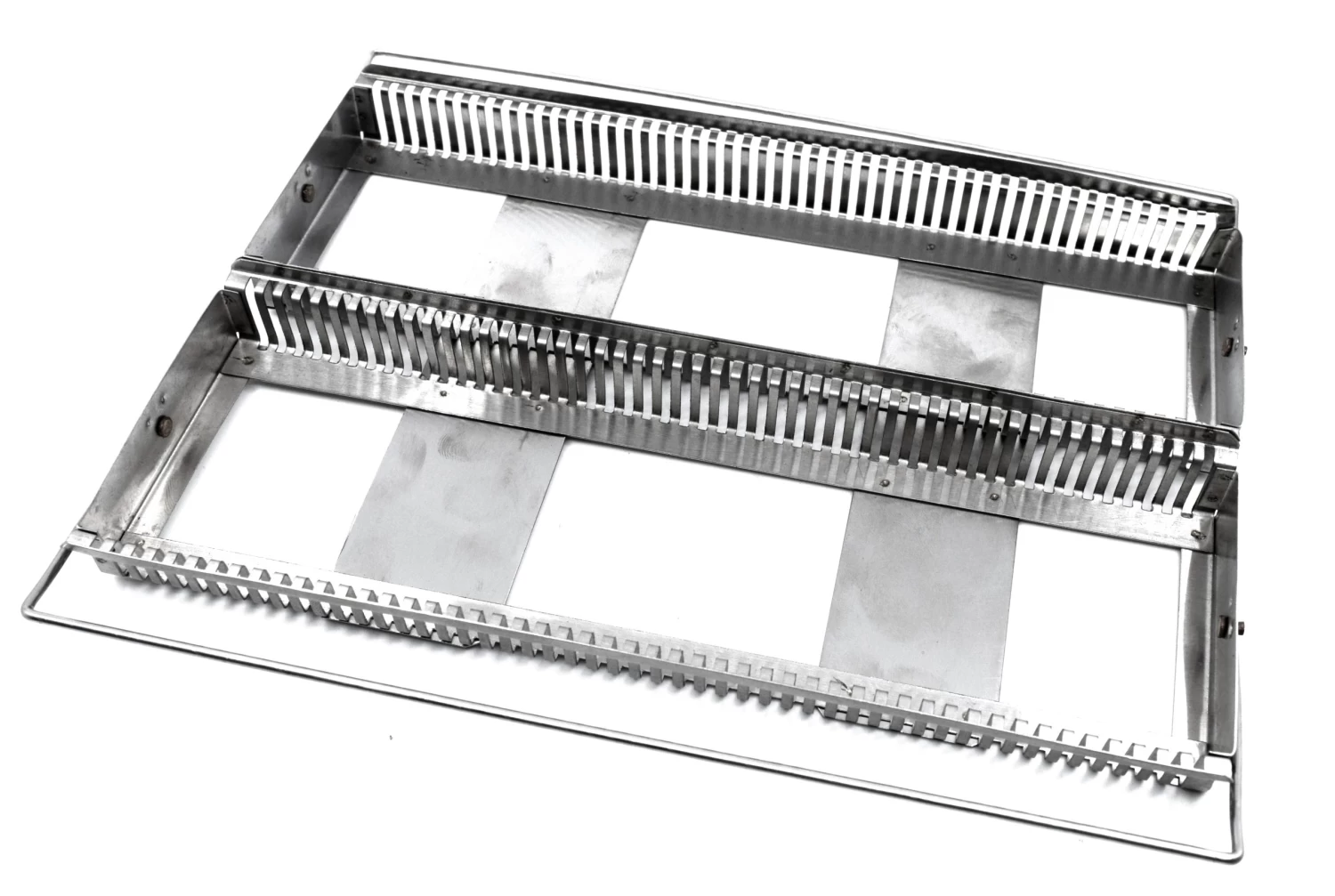 Staining rack made of Aluminum, with handles. Rack fits up to 100 slides, and features an open bottom for draining.