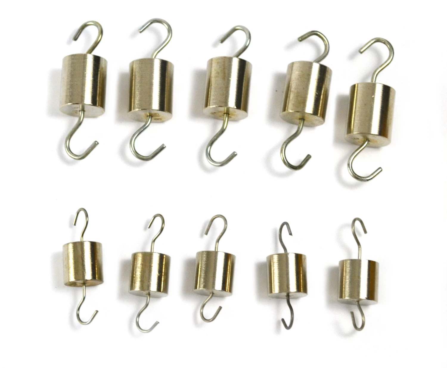 Eisco Labs Steel Cylinder Hooked Weights Steel Cylinder Weights, Set of 10, with hooks on both sides. Total amount of weight 375 grams 5 x 50 grams 5 x 25 grams Each weight is hooked on each side for experiments.