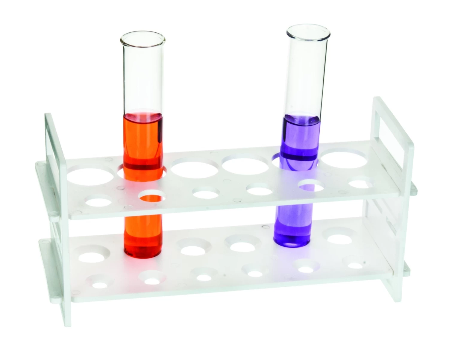 12 Hole Test Tube Stand – Holds (6) 30 mm Diameter and (6) 15 mm Diameter Test-Tubes, Made of Polythene. The stand ships flat packed and can be quickly assembled. The ability to assemble and disassemble makes it easier to clean.