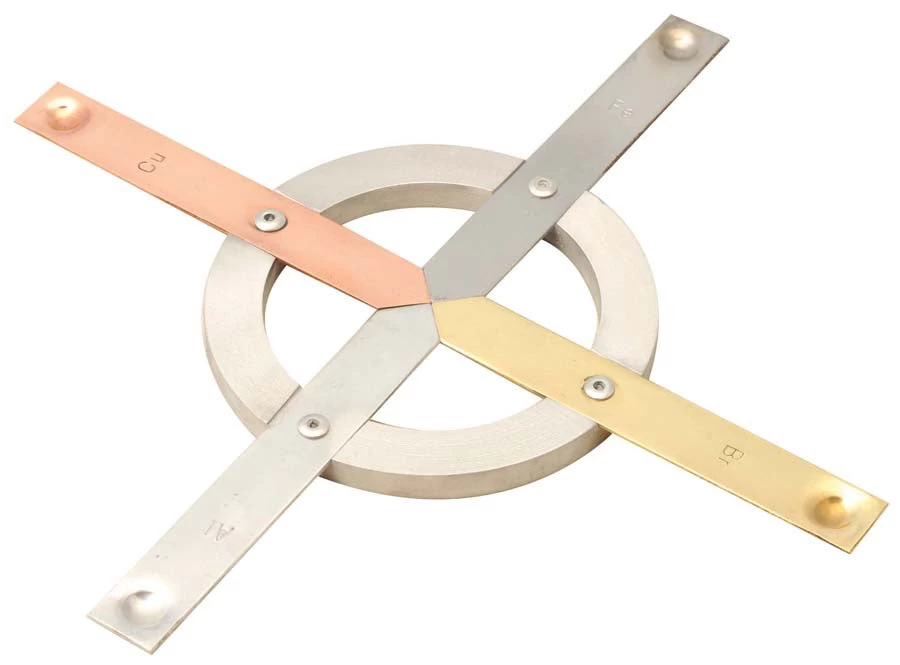 Comprising strips of copper, iron, aluminium and brass fixed on metal ring.