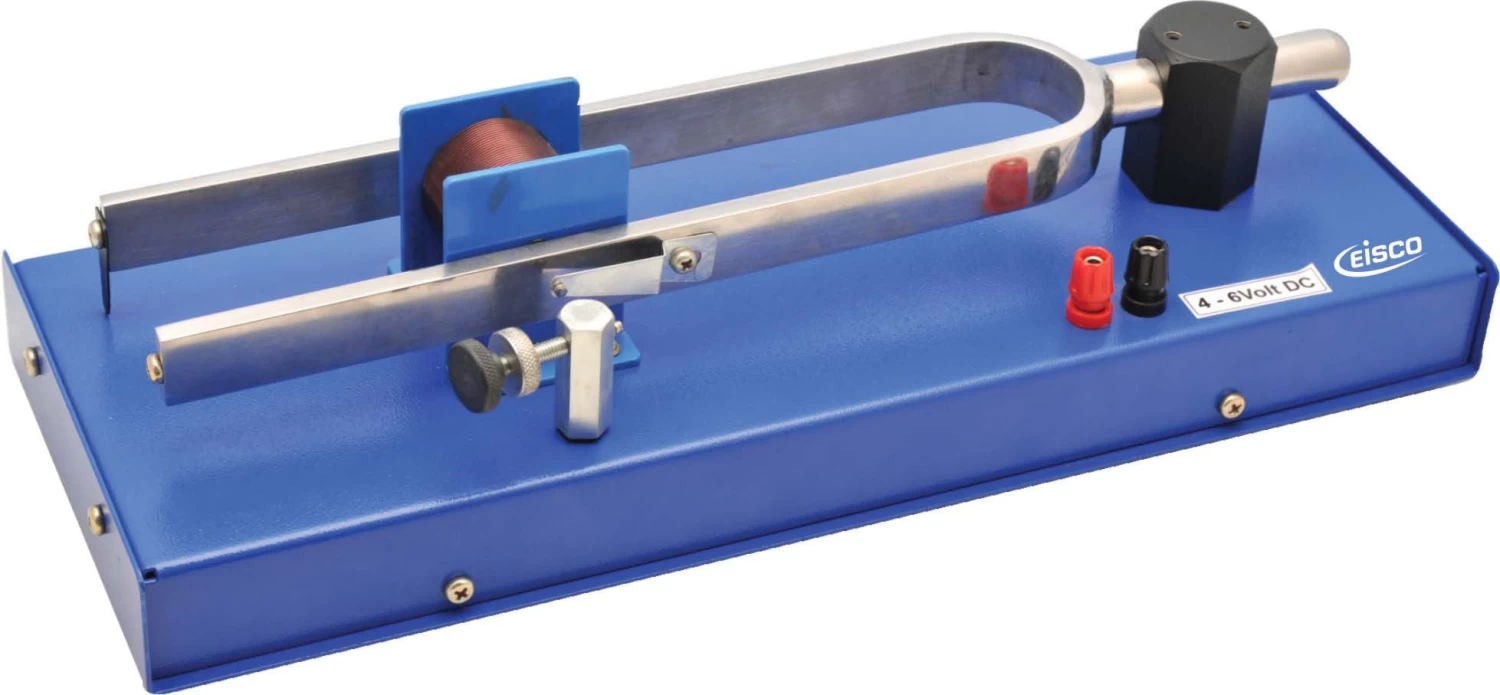 To show relationships between frequency, length, tension and mass or learn about Melde €™s standing wave experiments with this heavy duty electric tuning fork. An electromagnet drives the fork to a sustained frequency of approx. 80Hz. One prong of the tuning fork has a captive knurled thumbscrew for performing Melde €™s experiment. Amplitude of the tuning fork vibrations is varied by means of a threaded adjustment screw. Universal binding posts are finished to provide electrical power from an external source of 2 to 6 volts DC.