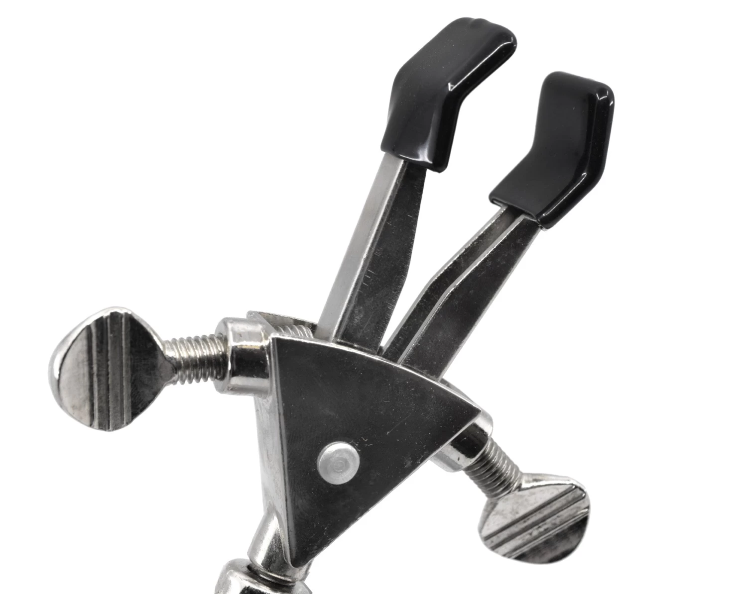 This jumbo size, universal clamp is designed to hold a variety of items. The two, vinyl coated jaws provide a firm grip and are adjustable on both sides with thumbscrews for a wide range of accommodation. Clamp is ideal for use with items that have straight sides, such as burettes, test tubes and flask necks. Accommodates apparatus up to 2.15″ (55mm) wide. Overall length is 8″. The attached swivel bosshead fits rods measuring up to 21mm in diameter.