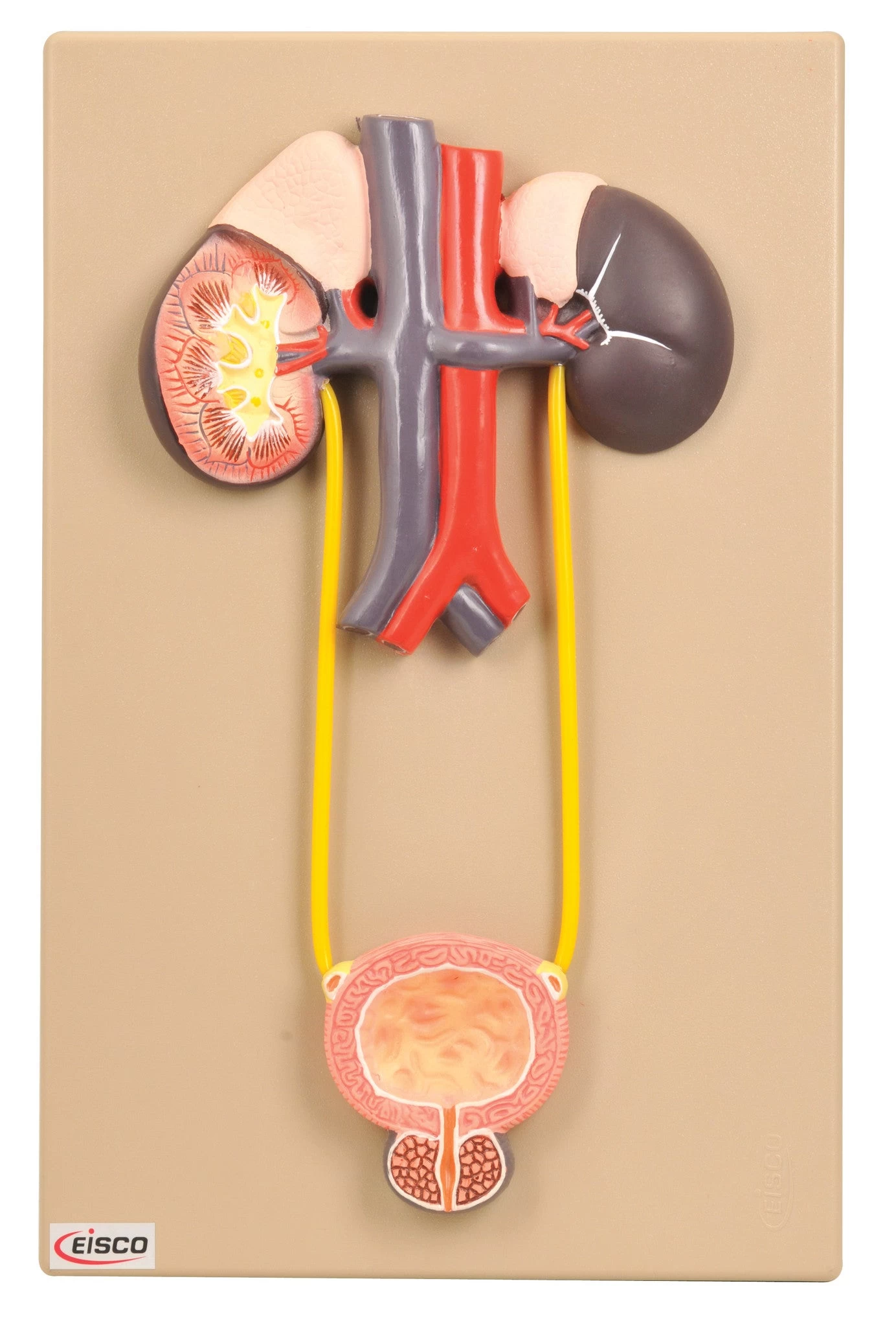 This hand painted model is natural sized showing the kidneys, ureters, adrenal glands, bladder, and prostate. The large abdominal right kidney is sectioned to show all anatomical details. It is mounted on a base and numbered with a key card.